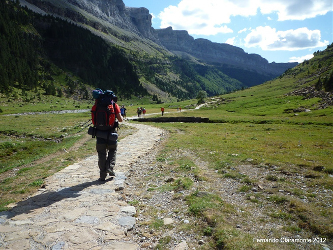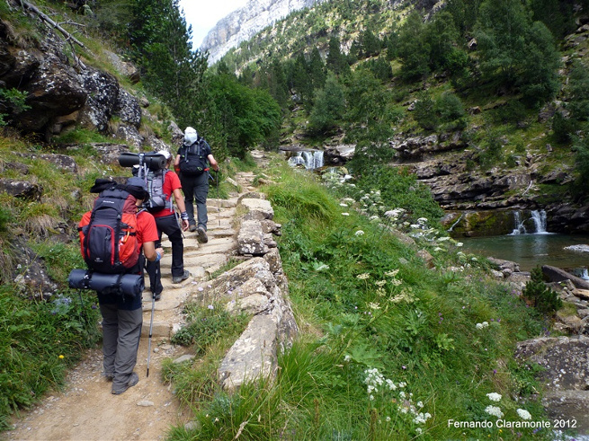 La llegada al refugio tiene que ser antes de las 18 horas para garantizarnos la cena. Una vez alimentados emprendemos por un camino frondoso que te impide ver el cielo y tan solo se escucha al margen derecho el agua que lleva el rio... gente, mucha gente nos encontramos sobre todo de bajada y es gente que ha venido a pasar el dia en el valle y de vez en cuando se ve bajar a gente con mochila y se aprecia que vienen de bajar de alguna de las rutas que el Parque te ofrece, además se les ve con cara de agotamiento.