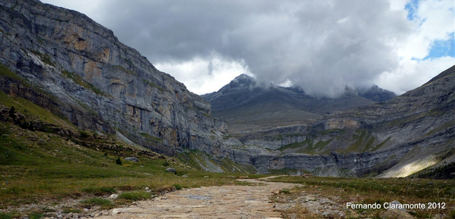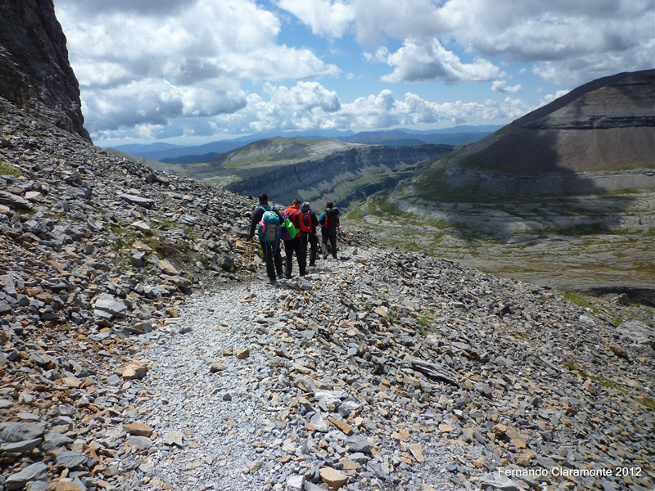 Regresamos por el camino de ida hasta llegar otra vez al punto de partida y mirando de reojo al Monte Perdido, consensuamos en que podemos hacerlo y tiramos hacia delante, pero a los pocos minutos de ascenso nos damos cuenta que no llevamos agua suficiente como para estar 4 horas mas por arriba y decidimos regresar al refugio donde nos quedaban una hora larga mas cuatro de regreso hasta el autobús que nos llevaría a Torla.