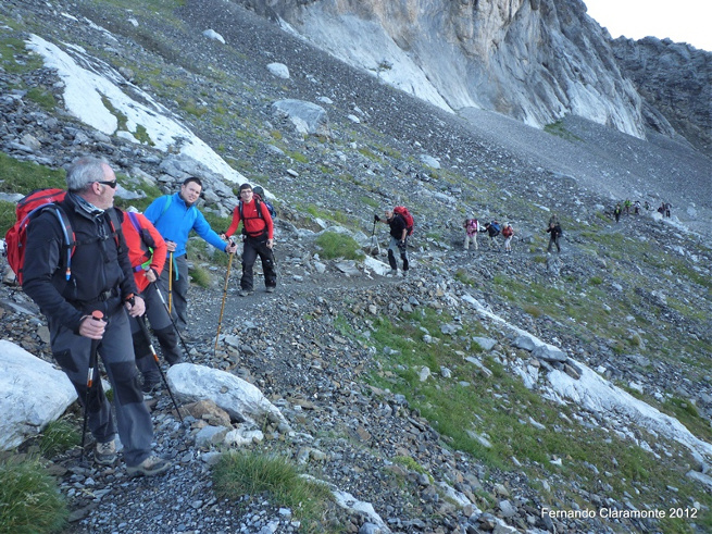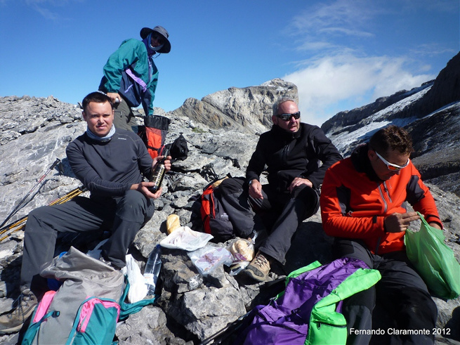 En un momento que descansamos y aprovechamos para cambiarnos de ropa los franceses nos vuelven a pasar y nos encontramos en una zona de trepaje fácil donde aquí ellos viran a la izquierda en busca de la famosa escupidera y nosotros a la derecha por una empinada pedrera que parece no terminar nunca.