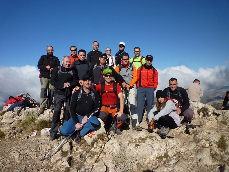 Eramos 16 los que iniciamos la salida desde la Font del Moli aunque en la foto inicial un grupo de 7 amigos venidos de Carcaixent de la mano de Datorllo hicieron cumbre por otra ruta alternativa.